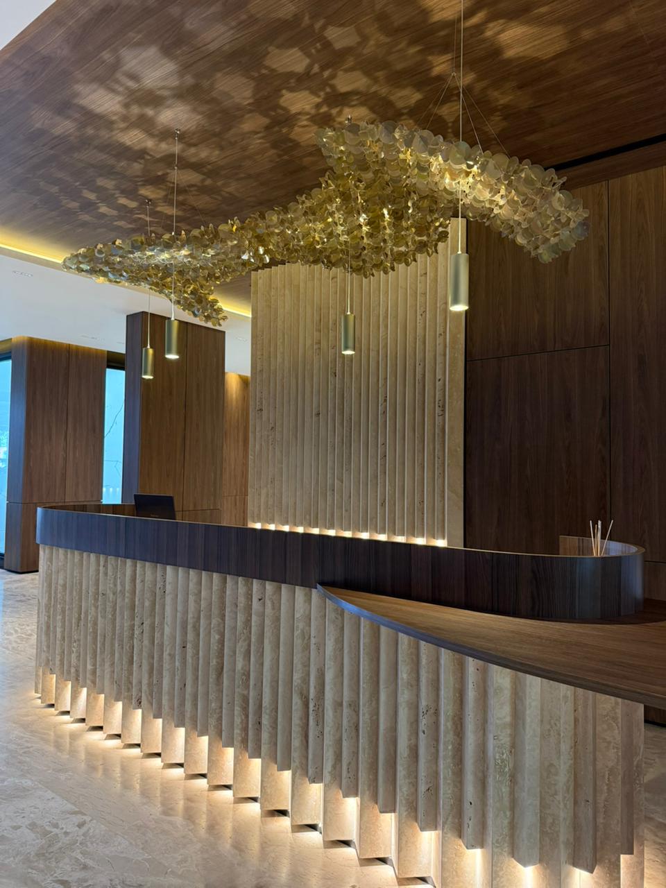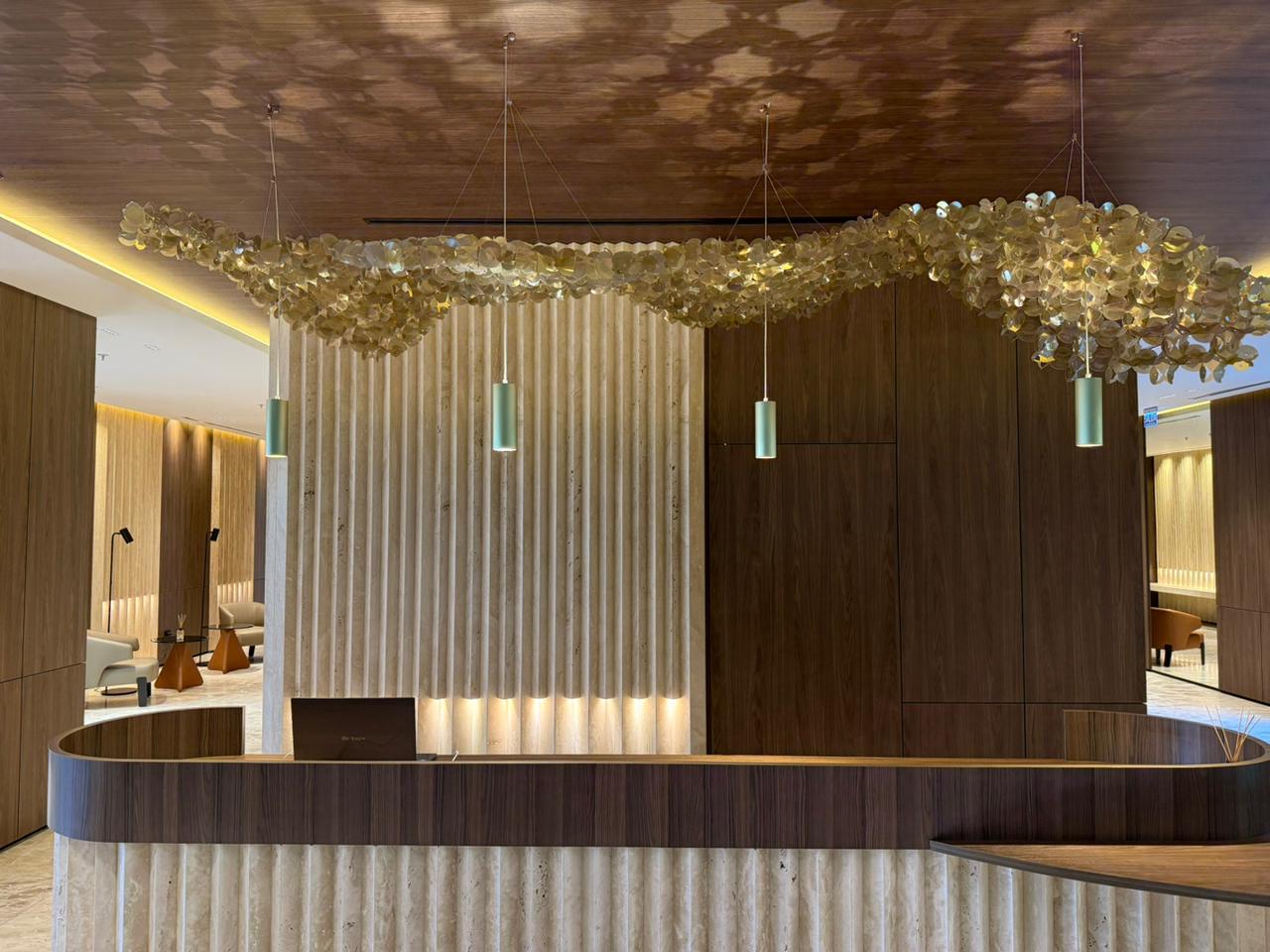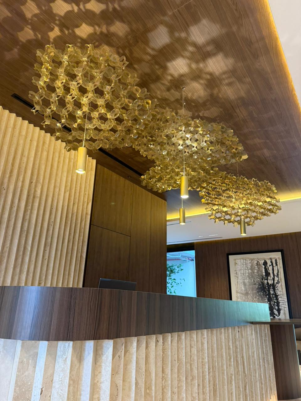 Hall acceso y frontdesk en Parque Alcantara donde desarrollamos una instalación de varios modulos NUVEM en tono velvet, acompañados de tubos bidireccionales para iluminar el mostrador e indirectamente el techo.