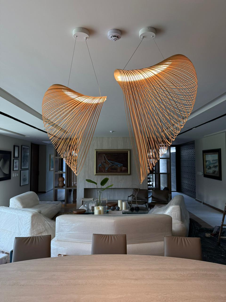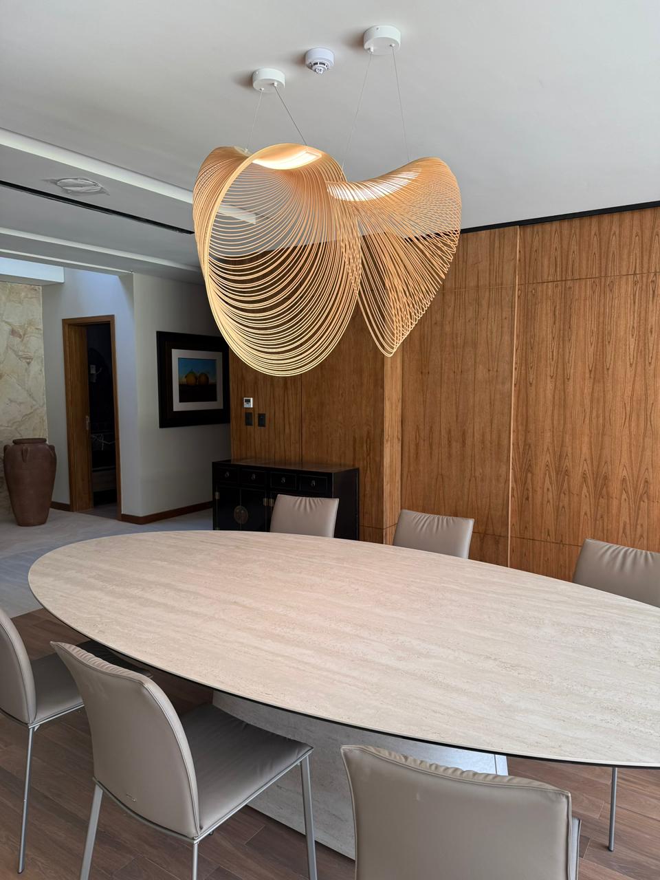 Acompañando el interiorismo elegante y moderno, instalamos 2 lámparas de diseño en madera natural con sistema LED integrado. La fusión de los elementos eleva el proyecto como también brinda un efecto de luz cálido y difuso.